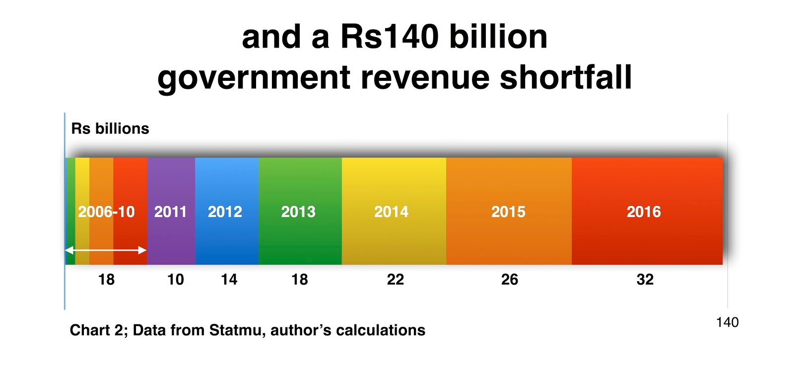 With respect to the robust growth trajectory that Sithanen's flat tax was supposed to place our economy on. The shortfall was about Rs5 billion in 2006 but has been growing exponentially because we managed only a 4% average growth over the last decade. Add all the shortfalls -- shown in red in the above chart -- together and you get Rs927 billion. That's greater than our GDP for 2006, 2007 and 2008 lumped together by almost Rs200 billion. Or a little more than three times our 2010 domestic production. The cumulative shortfall at the end of 2016 will likely be a tiny bit larger because the growth forecast has been revised downwards.